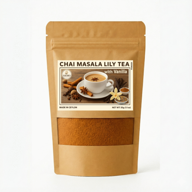 Chai Masala Lily Tea – Vanilla Mixed is a soothing herbal blend made with lily petals, warm masala spices, and natural vanilla. It delivers a gentle floral aroma, mild sweetness, and comforting chai flavor without caffeine. Ideal for relaxing moments, evening tea, or a smooth herbal latte.